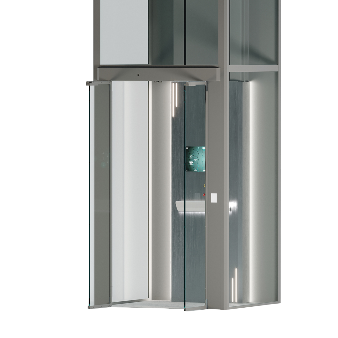 Se suministra con puertas automáticas de cristal completo y una amplia gama de acabados personalizables, incluyendo vidrios ahumados, acero inoxidable y suelos en PVC efecto mármol u hormigón. Además, puede instalarse en ejes panorámicos acristalados, ideales para ambientes luminosos y modernos.